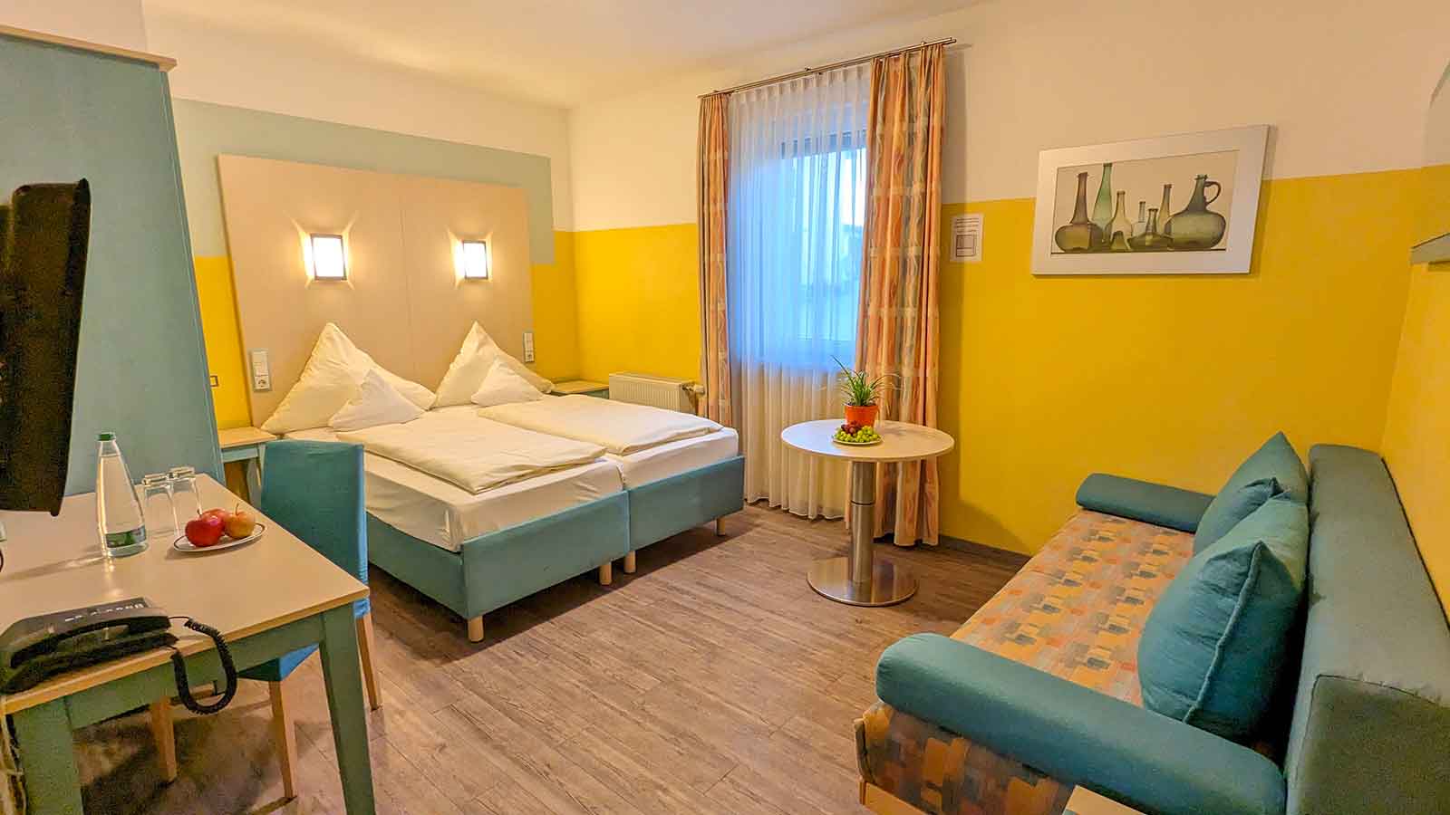 Die Zimmer verfügen über ein Doppelbett mit zwei getrennten Matratzen und ein Schlafsofa und sind in hellen und warmen Tönen gehalten.